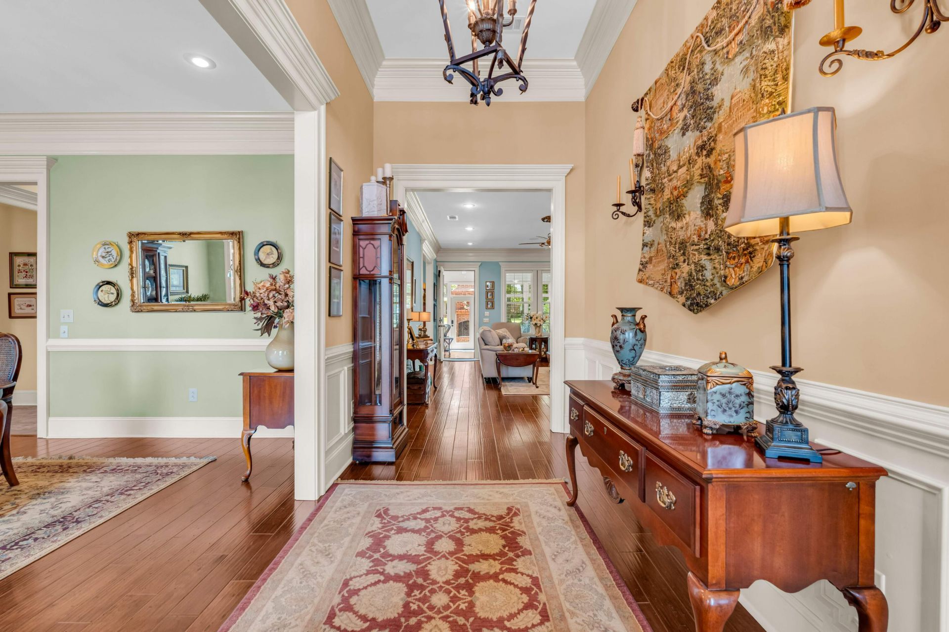 One-owner custom built 4 bedroom/3.5 bathroom Country Club Estates home offers a home office, home gym/second office, safe room, and a sunroom. You will be wowed by beautiful moldings, medallions, hardwood floors, and gorgeous kitchen and so much more. Please see the attached supplement for detailed Special Features! Greek revival /period molding Size of lot? Apx 1/3 acre Appx Sq. Footage 3800 + Raised monolithic foundation Out side Fire place w/ extended brick work & storage for wood Brick laid on house in unique pattern w/ decorative style over garage and at back patio both sides Professionally landscaped & stone lined flower beds Under ground drainage and sprinkler system paver brick front porch and garage entry Ex-large 3 car garage w/ full attic garage storage plus*** Walk up stairs w handrailing to attic Outside speciality lighting 3 heating and cooling units/ zones Rinnai tankless hot water system Central vacuum system Security and stero system Safe room 10 ft ceilings with 8 foot doors Front entry ? Ceiling Custom-detailed interior& exterior molding Ceiling Medallion in dinning and living room Custom cabinetry throughout house 1st floor hard wood and tile Large 4 bedrooms w/ ceiling fans& Custom closets Large study upstairs w/ ceiling fan 2 full baths, 1 jack & Jill, 1 half bath Granite counter tops in all full bathrooms & jack & jill 2 gas fireplaces Air jet tub in primary bath & water filter by sink Custom designed closets and pantry Custom storage for China and linens Granite kitchen counter tops & island w/ electrical outlet Decorative tiled kitchen backslash Above and under cabinet lighting in kitchen Double ovens w/ warming drawer, bilt in microwave Pullout kitchen drawers w/ pegs for China & dish storage Glass front kitchen cabinetry Speciality storage for trays, spices, cookbooks and recipes Speciality storage for liquor bottles Wet bar w/ sink & water filter, wine storage, ice maker and wine beverage cooler Custom built in desk and bookcases Enclosed sunroom w/ split unit, gas fireplace,ceiling fans W/ connect for gas heater,waterfountain and speciality stained leaf print floor Custom cabinetry in laundry w/ hanging for clothes Custom built play house retaining walls Extra wide stairs w/ handrails Dishwasher apx 2 years old Outside utility room 4 outside water hydrants Outside electrical outlets Detailed labeled fuse boxes Paneled inside garage& trimmed w/ key code entry Partial curb for driveway Gutters