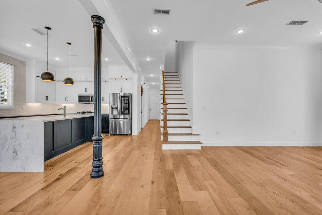 Four Bedroom Southern Colonial in Adelaide on South Montgomery | Main Entrance Features Covered Front Porch w/Herringbone Brick Design | First Floor Offers Open Living Space, Dining Area, Kitchen, Powder Room, Utility Room, Primary EnSuite, Screened Outdoor Living Space, & Private Courtyard Retreat | Kitchen w/Marble Waterfall Island, Hop-Up Bar, Stainless Appliances, Gas Range, Floor-to-Ceiling Cabinets w/Rolling-Ladder | Expansive Primary EnSuite Features Floating Double-Sink Vanity, Herringbone Tile Design, Oversized Soaking Tub, Frameless Shower, & Walk-In Closet | Second Floor Features Landing Area w/French Door Access to Covered Balcony & Two EnSuite Bedrooms w/Walk-In Closets | Third Floor Offers Fourth Bedroom/Bonus Room | Three-Car Garage + Three Uncovered Spaces