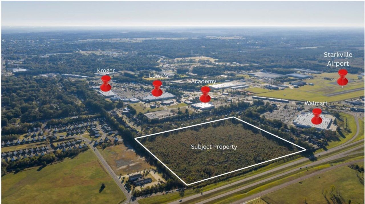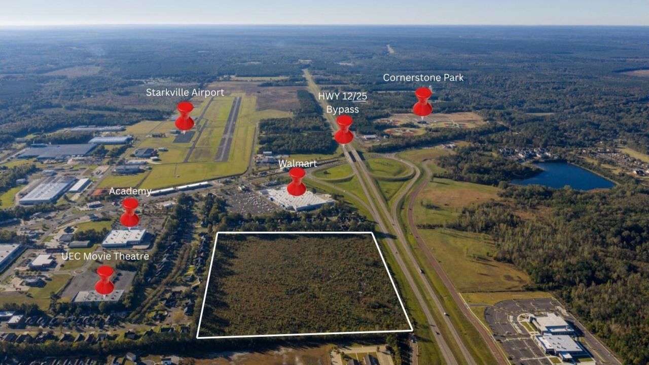 Don't miss this rare opportunity to own nearly 39 acres of premium commercial land in one of Starkville's most rapidly developing areas! This property is ideally positioned next to Walmart and just minutes from Mississippi State University and Cornerstone Park, Starkville's premier sports and recreation destination.Situated along the busy Highway 25 corridor, this tract offers excellent visibility, high traffic counts, and convenient access?ideal for hotels, restaurants, retail centers, medical facilities, or mixed-use projects.The property is also adjacent to the Starkville Airport and near the newly constructed Mississippi Highway Patrol station, adding to the area's accessibility and infrastructure growth.
